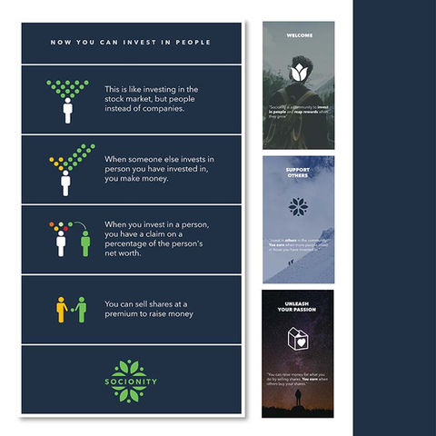 The logo is simplest form collaboration and growth together the tagline of brand that is "rich together" showcases the social nature and keeps the opportunity to grow into a social platform for the app open. the colors identify to zest and proffesionalism. the infographics style encompasses the use of brand pattern the green socion coin.